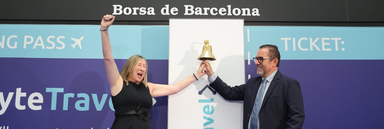BME Scaleup ha dado hoy la bienvenida a Bytetravel. El tradicional Toque de Campana celebrado en la Bolsa de Barcelona ha estado protagonizado por Axel Serena, CEO de la compañía, y Carmen Sánchez, directora de operaciones, quienes han estado acompañado por Jesús González, director gerente de BME Scaleup, y Eduardo Ansaldo, presidente de la Bolsa de Barcelona.